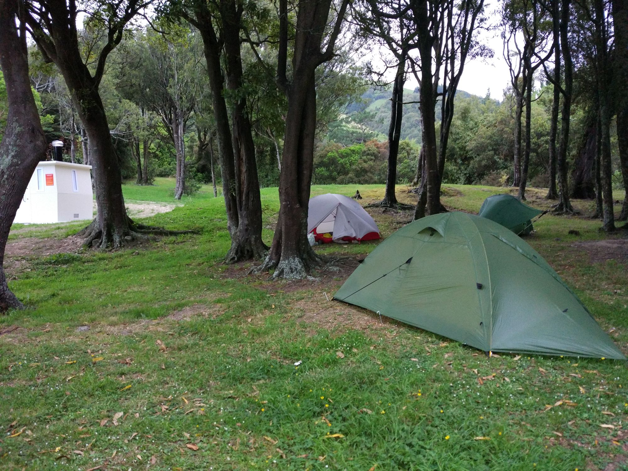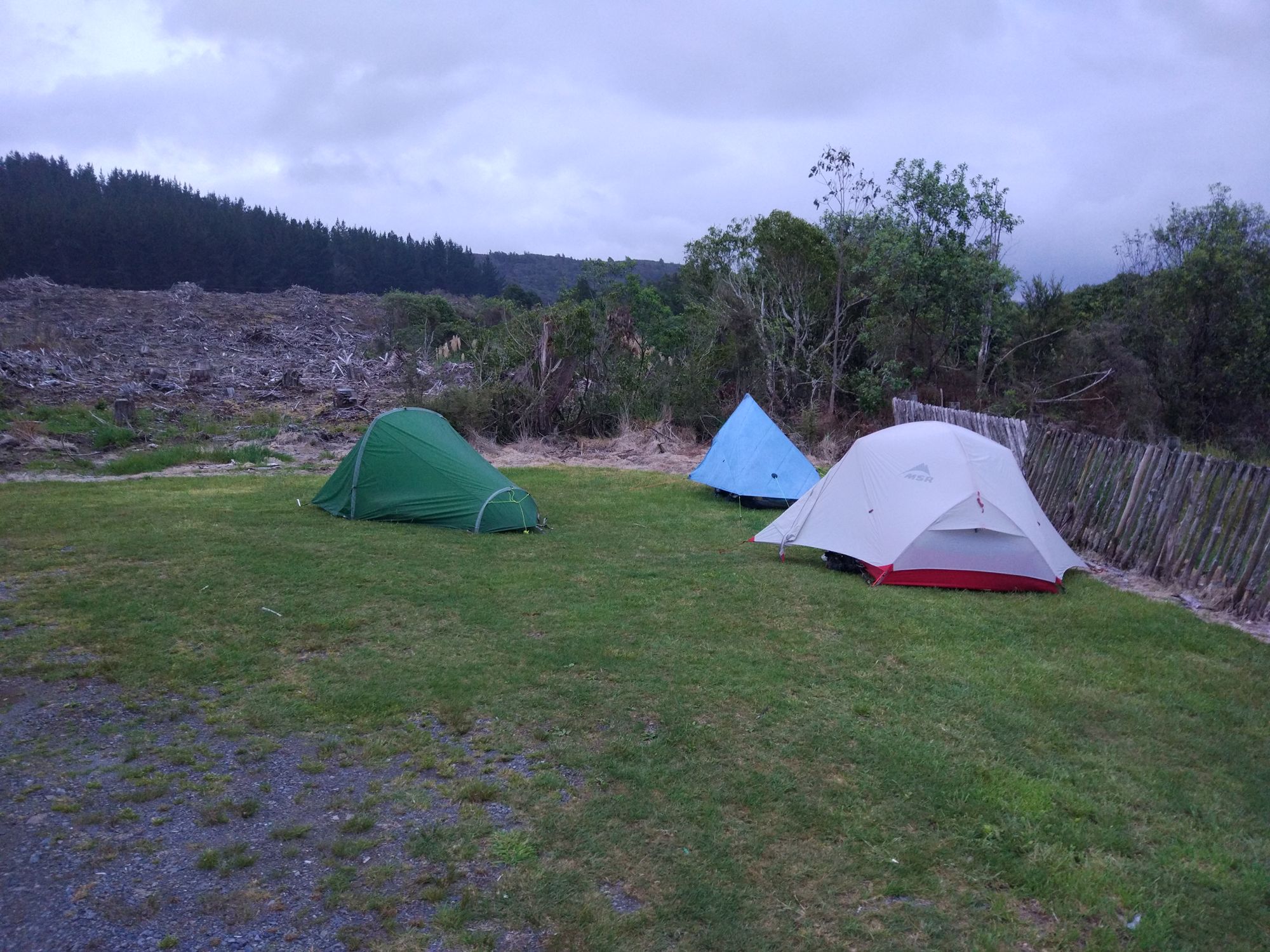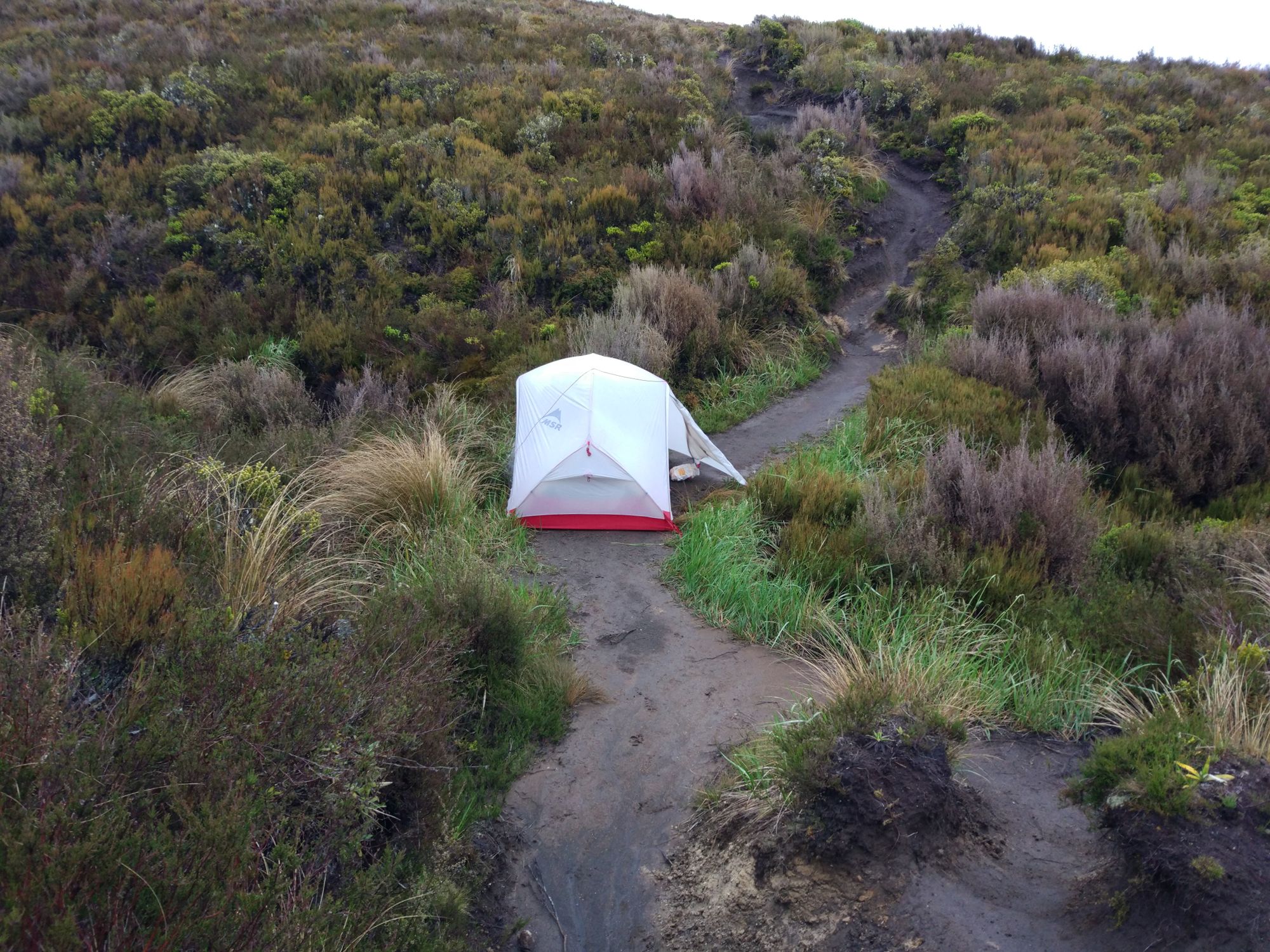 Im Informationzentrum von Taumarunui hatte man uns gesagt, dass man nach der Hütte überall, außer direkt auf dem Trail, campen darf. Wir also weiter und der Regen ließ auch mal nach, aber wir fanden keinen Spot zum campen. Auf Lavauntergrund wächst allen scheiß, aber keine ebene Gras- oder Wiesenfläche. Irgendwann fanden wir eine kleine Ecke für Michéles Zelt. Rhys wollte, da er kein Zelt sondern nur ein Tarp hat, in dem Gestüpp übernachten. Also ich alleine weiter. Habe geschaut, wie weit das nächste Kaff weg ist und es waren 3,6 Km. Kurz überlegt und dann entschieden, wenn ich nichts finde, gehe ich bis dahin. Aber nach ca. 1 Km fand ich einen perfekten Spot für mich. OK, der war mitten auf dem Trail, war mir dann aber scheißegal. Zelt aufgebaut und nachdem das Innenzelt stand, fing es wieder an zu tropfen.