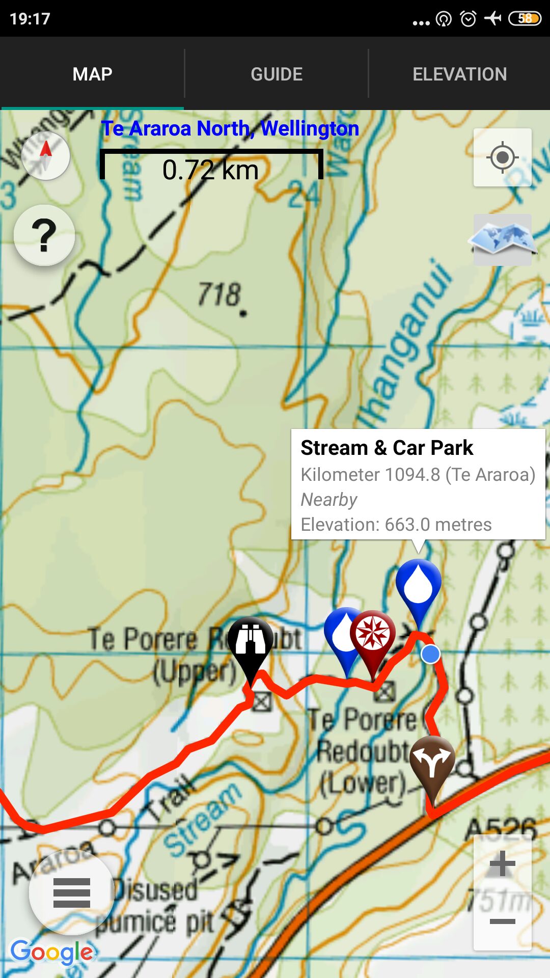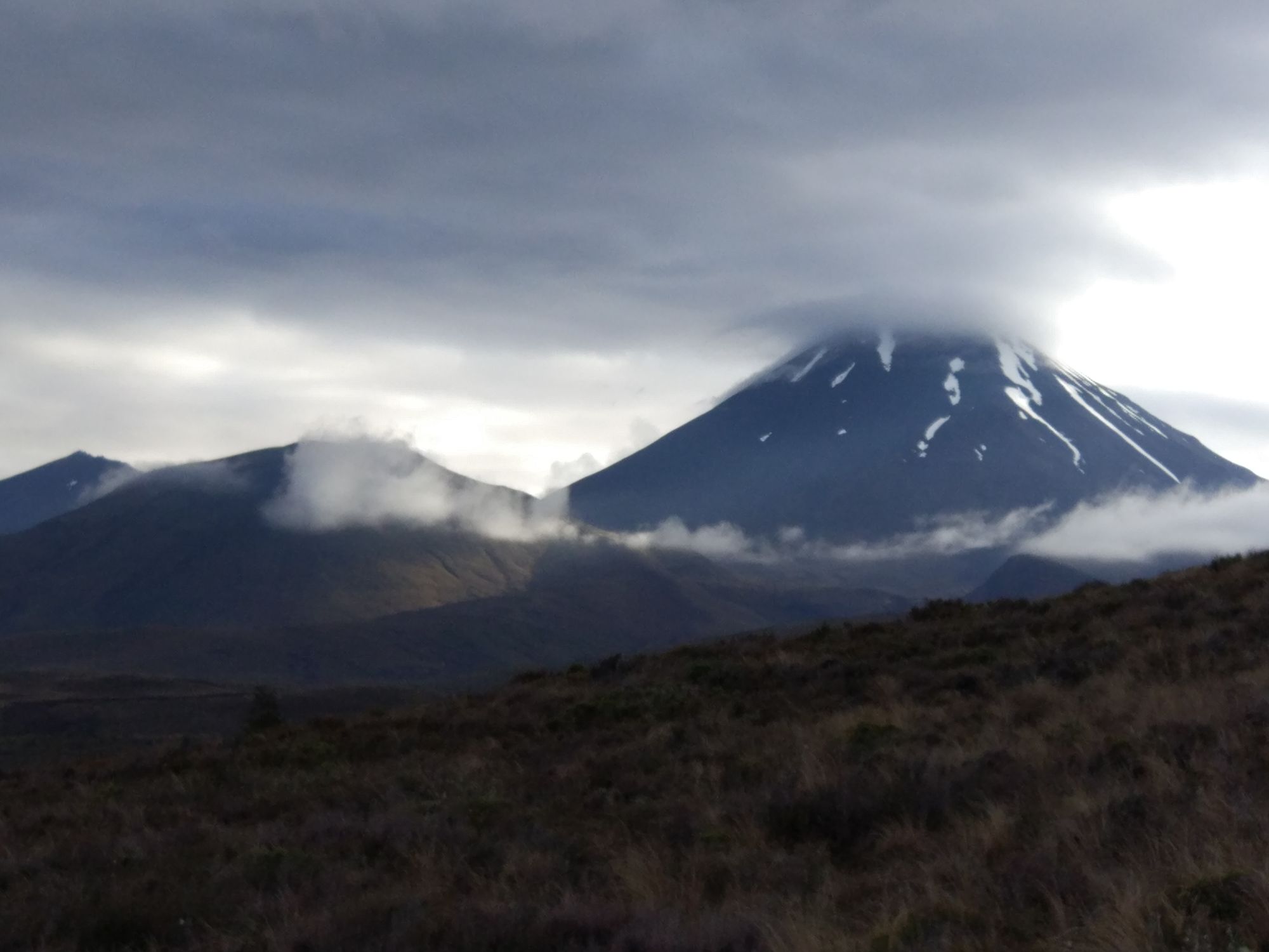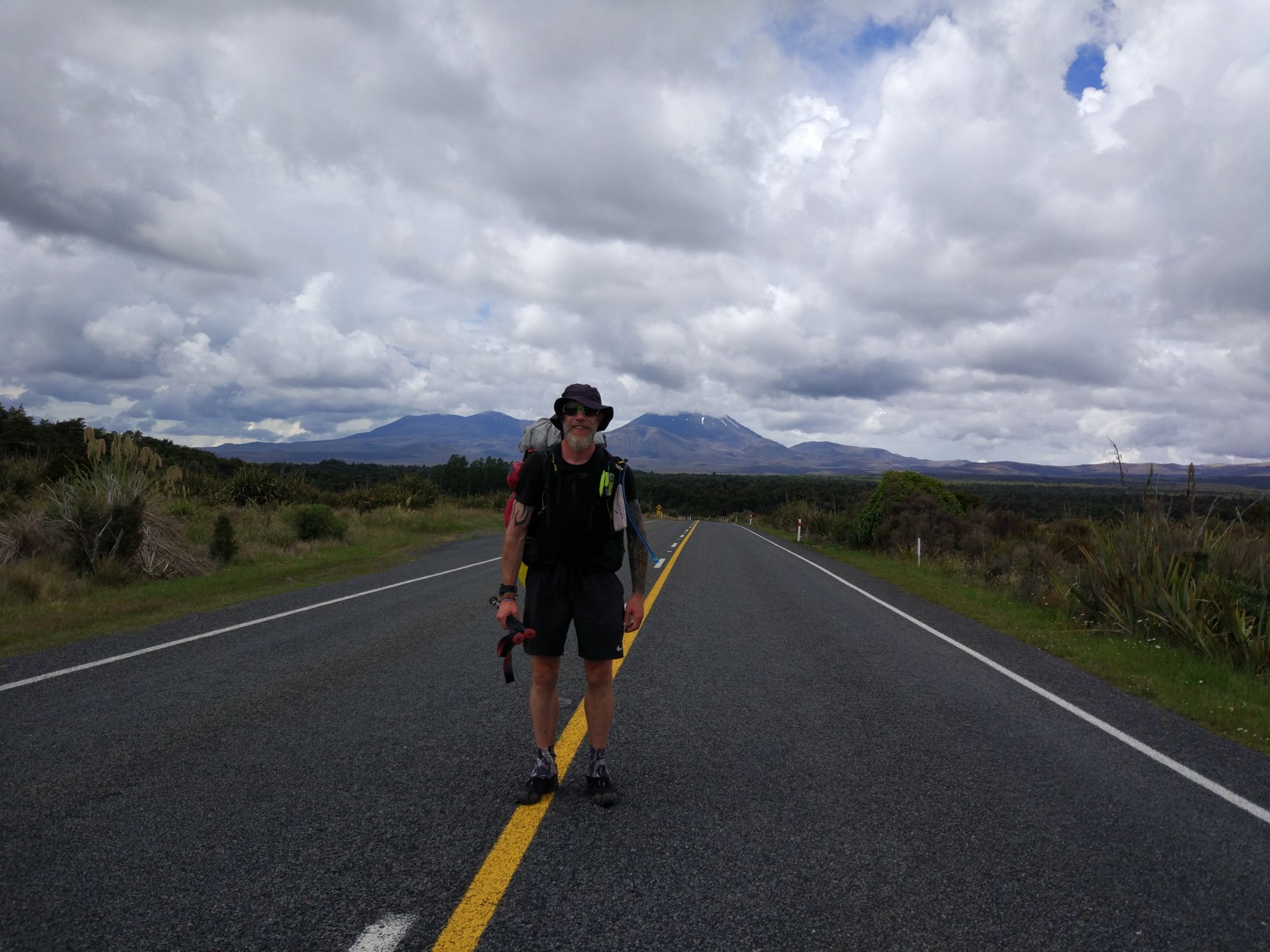 Im Informationzentrum von Taumarunui hatte man uns gesagt, dass man nach der Hütte überall, außer direkt auf dem Trail, campen darf. Wir also weiter und der Regen ließ auch mal nach, aber wir fanden keinen Spot zum campen. Auf Lavauntergrund wächst allen scheiß, aber keine ebene Gras- oder Wiesenfläche. Irgendwann fanden wir eine kleine Ecke für Michéles Zelt. Rhys wollte, da er kein Zelt sondern nur ein Tarp hat, in dem Gestüpp übernachten. Also ich alleine weiter. Habe geschaut, wie weit das nächste Kaff weg ist und es waren 3,6 Km. Kurz überlegt und dann entschieden, wenn ich nichts finde, gehe ich bis dahin. Aber nach ca. 1 Km fand ich einen perfekten Spot für mich. OK, der war mitten auf dem Trail, war mir dann aber scheißegal. Zelt aufgebaut und nachdem das Innenzelt stand, fing es wieder an zu tropfen.