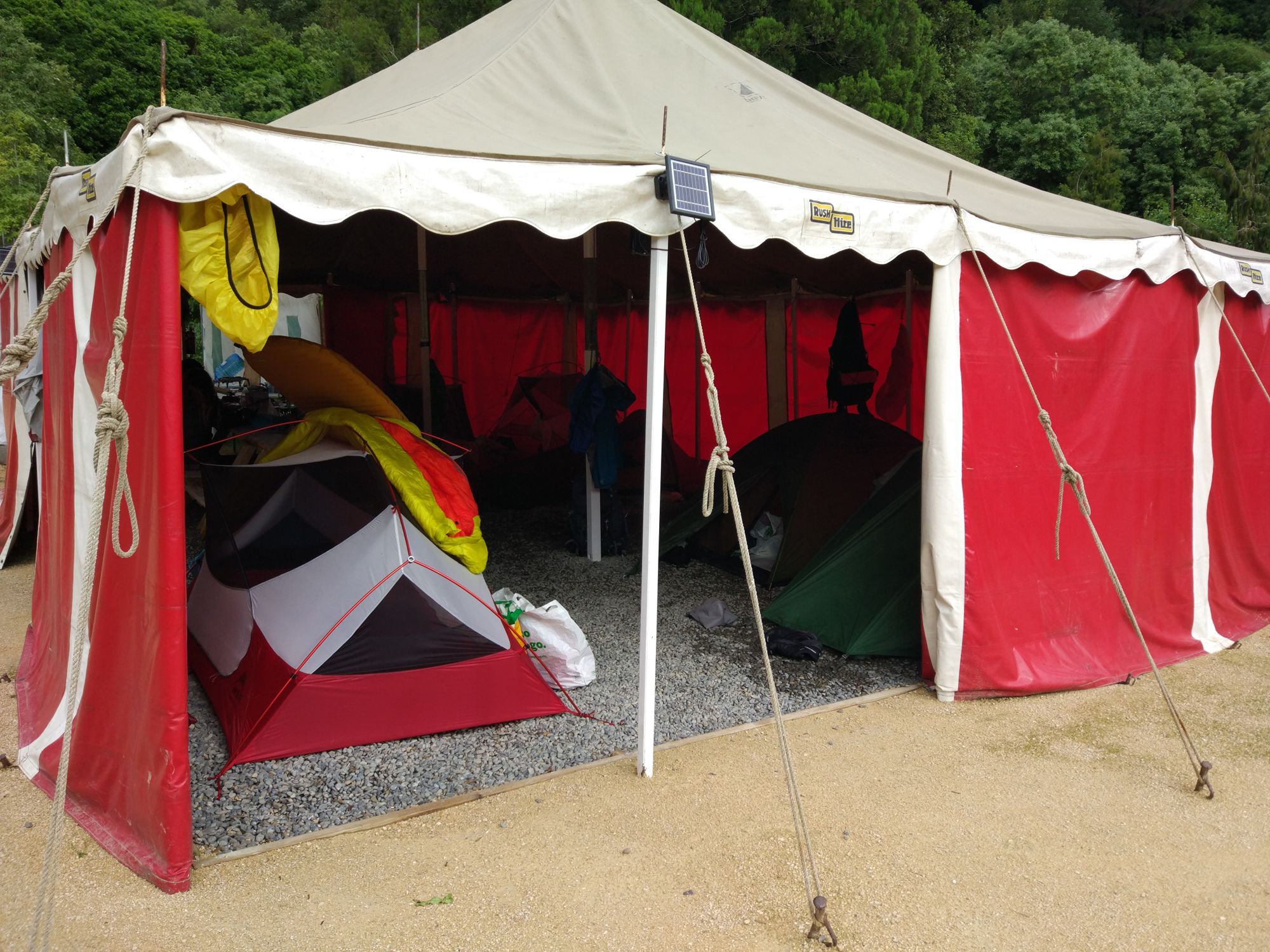 Die restlichen 2-3Km ging dann über einen Schotterweg zu unserem heutigen Campplatz. Hier zelten wir in unserem Zelt in einem großen Zelt.