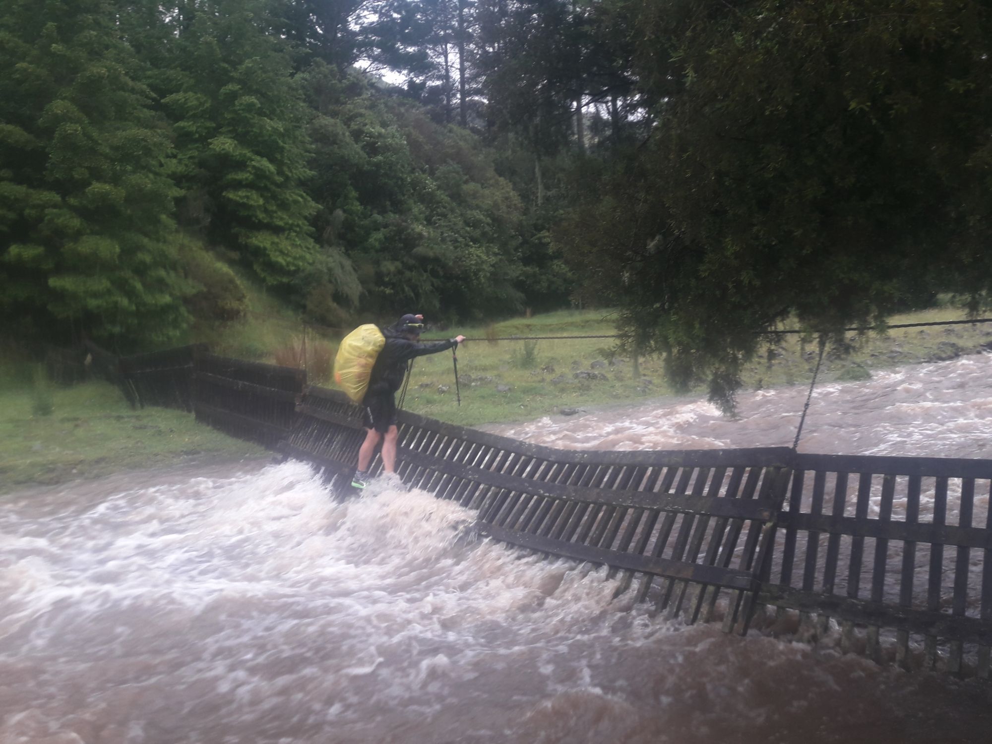 Die Qualität der Bilder ist heute nicht ganz so gut, da wir eine Schutzhülle brauchten, wegen des Regens. Das Gefährliche heute war der folgende Fluss, den es zu überqueren galt. Erst versuchten wir es auf die herkömmliche Art, mit durchwaten, merkten aber schnell, dass das viel zu gefährlichen, wegen der reißenden Strömung war. Dann haben wir das Stahlseil mit dem Zaun benutzt um rüberzukommen.