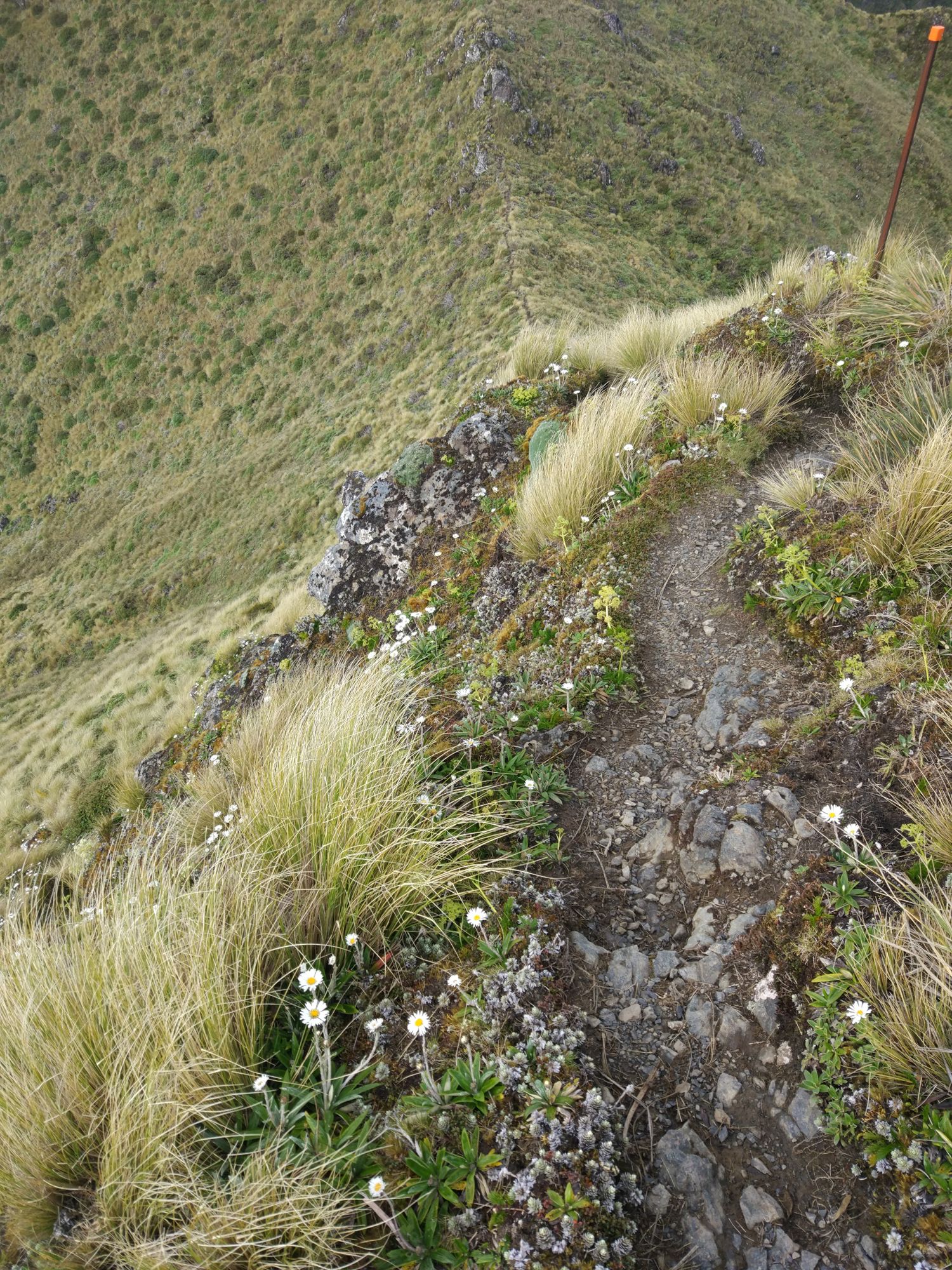 Nun ging es immer wieder hoch und runter, wobei die Abstiege wesentlich schwieriger und gefährlicher waren, da es von dem Regen immer noch rutschig und matschig war. Des Weiteren sind auf der Höhe nur so komische Graspflanzen, die einem die Sicht auf den Boden versperren. Das trägt auch nicht zur Sicherheit bei, weil man fast immer seine Schritte ins ungewisse macht.