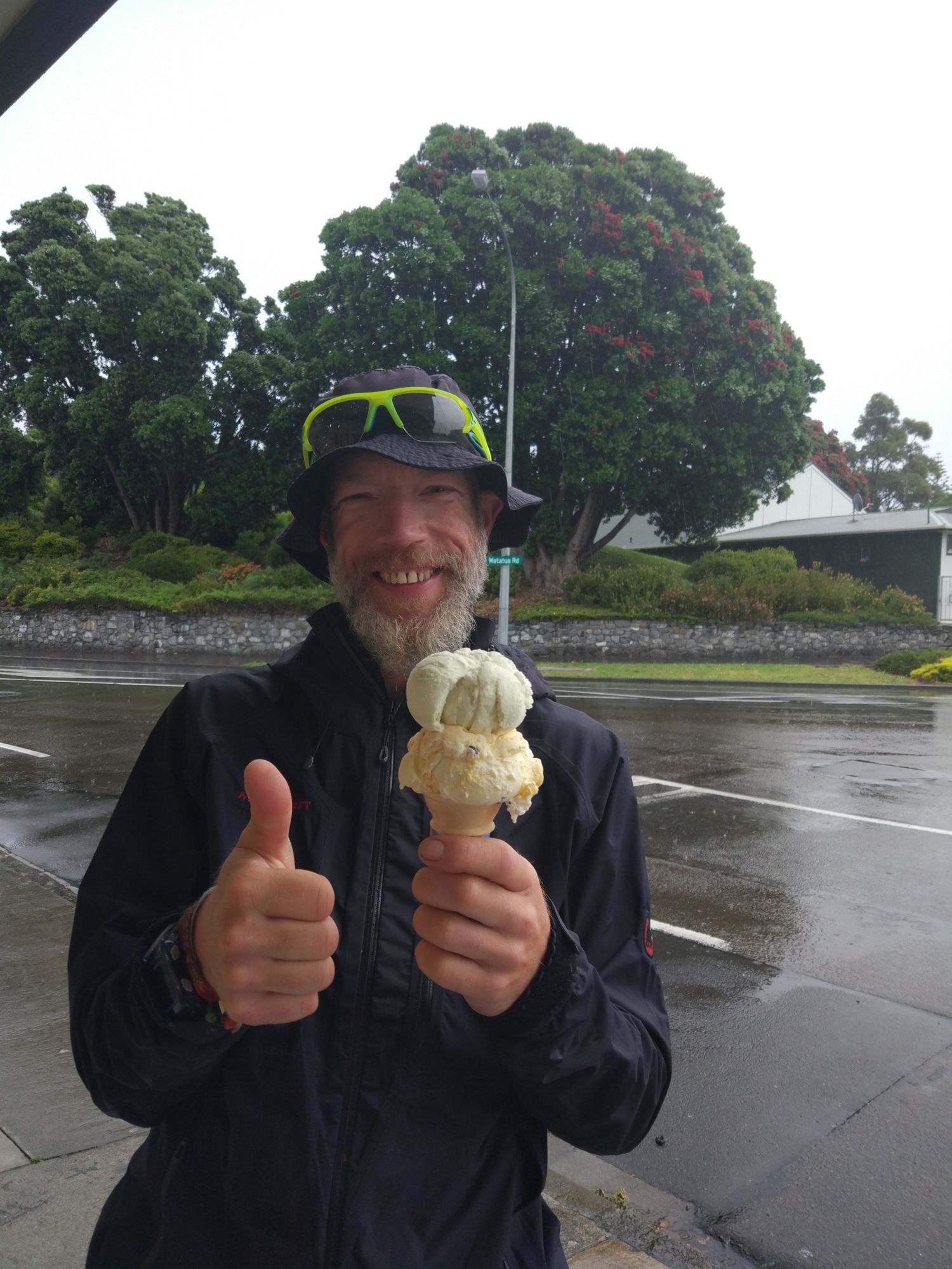 Das hatte für mich aber zum Vorteil, dass wir an einem Dairy-Shop vorbei kamen, der zu Christmas hier geöffnet hatte. Wie oben erwähnt, regnete es sehr stark. Wir also rein in den Shop und ich bestellte mir 2 Kugeln Icecream. Der Typ war so perplex und fragte mich, ob ich das ernst meinte. Ja, erwiderte ich, denn es ist eins der besten was ich kenne. Der Typ meinte nur noch: „You made my day“. Er hat zu Weihnachten noch nie Icecream verkauft sagte er noch, dazu noch bei diesem Wetter. Michéle und Jonas kauften dann auch noch jeweils eins. Das wieder zu einem Preis von 2,10€.